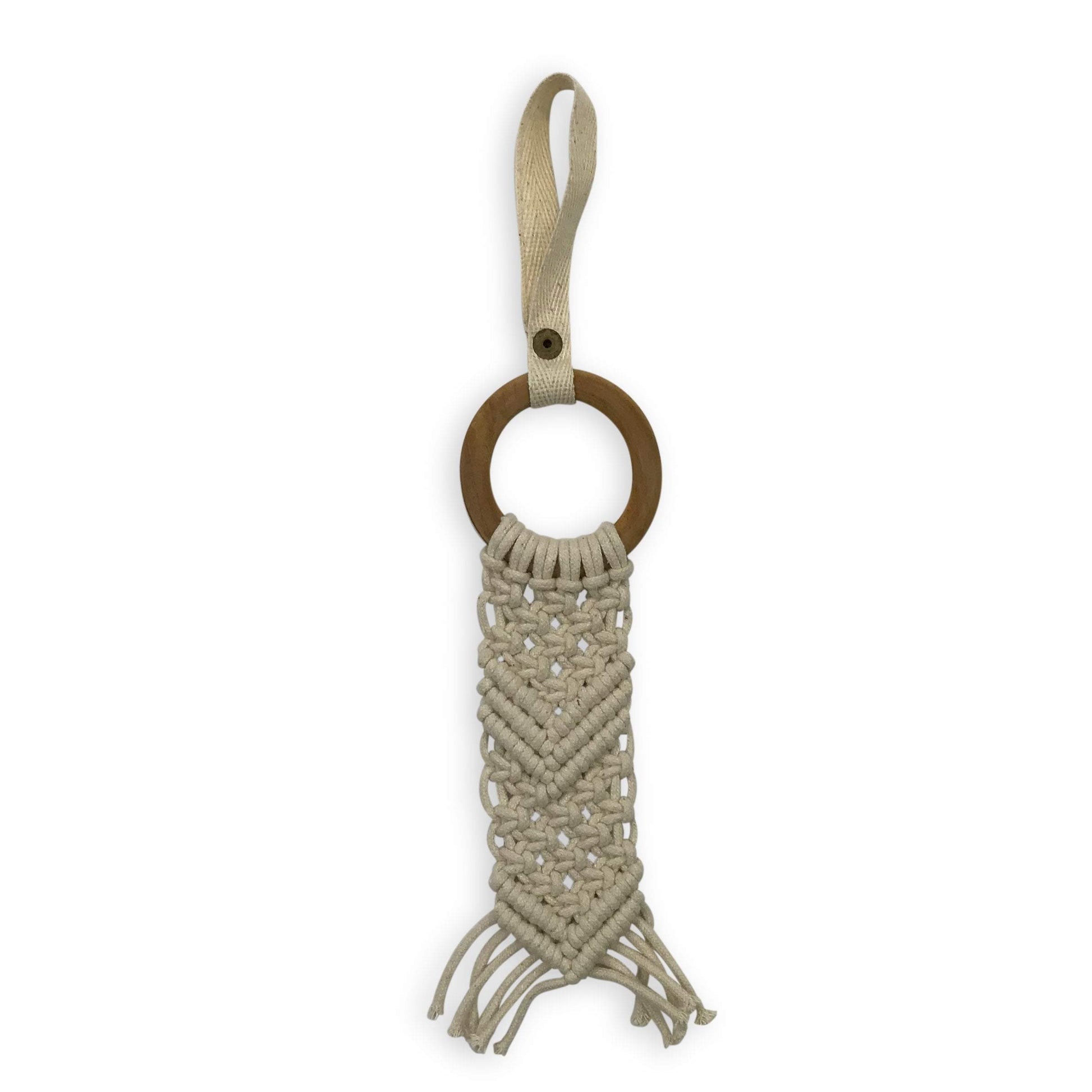 The macrame toys are hand-knotted by artisans in India using organic cotton rope. With their beautiful knotted textures and smooth wood beads, they provide great tactile sensations to engage your little one. They can be clipped onto strollers, highchairs or carseats—and onto our bestselling Play Gyms!